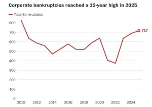 Selon un article du Washington Post publié fin décembre 2025, l’économie américaine fait face à une vague de faillites d’entreprises alarmante, atteignant des niveaux inédits depuis la période post-Grande Récession de 2010. En l’espace de onze mois, au moins 717 sociétés ont déposé le bilan, ce qui représente une augmentation de 14 % par rapport à l’année précédente. S’appuyant sur les données de S&P Global Market Intelligence, le journal attribue cette détérioration à un environnement économique devenu hostile, dominé par l’inflation, des taux d’intérêt élevés et les politiques commerciales agressives de l’administration Trump.